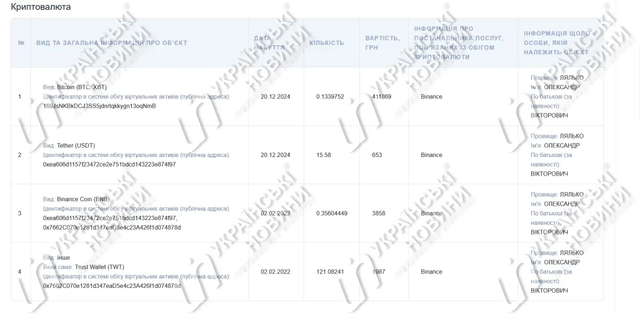 Так, згідно з документом, наприкінці 2024 року Лялько отримав у власність криптовалюту Bitcoin, вартість якої становить 411 тисяч 869 гривень. У той же день він докупив Tether (USDT). При цьому, в активі працівника ТЦК також є Binance Coin, який було придбано ще у 2022 році.