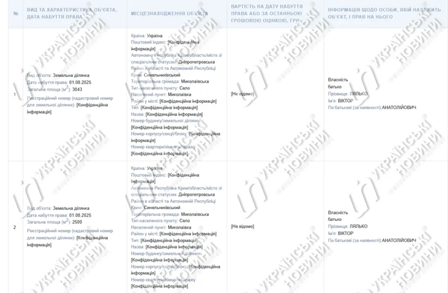 Варто зазначити, що у 2025 році батько працівника ТЦК, який є пенсіонером і за рік отримав 198 тисяч 737 гривень пенсії, придбав дві земельні ділянки у с. Миколаївка Дніпропетровської області загальною площею 5 543 м². Але вартість активу не повідомив.