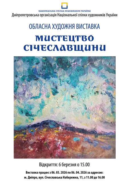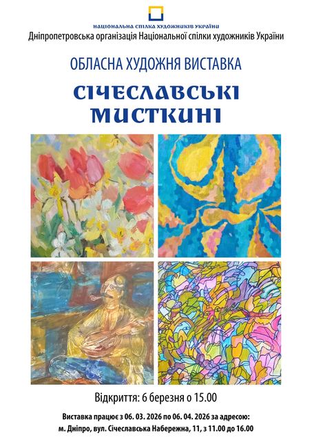 «Шановні митці та шанувальники мистецтва!6 березня о 15.00 запрошуємо вас у виставкову залу ДОНСХУ на відкриття двох обласних виставок: "Мистецтво Січеславщини" і "Січеславські мисткині".