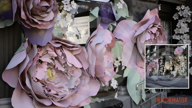 Композиция состоит из гигантских пионов, роз и других цветов. Они закреплены на фасаде строения и дополнены маленькими декоративными элементами. Цветы имеют нежные пастельные цвета – розовый, бежевый и белый.