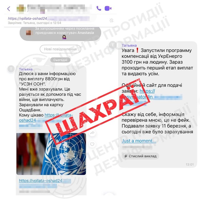 Зловмисники розсилають повідомлення про нібито виплату 8800 грн від ООН як допомогу під час війни та 3100 грн від Укренерго.