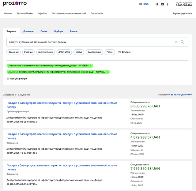 Це — друга спроба провести у 2026 році тендер на утримання автономної системи поливу. Перша була 5 березня 2026 року, тоді у торгах взяла участь лише одна компанія — ТОВ «Автоматичні системи поливу та обладнання Дніпро». Пропозицію компанії відхилили. Як написано у протоколі розгляду, пропозиція «не відповідає умовам технічної специфікації та іншим вимогам щодо предмета закупівлі».