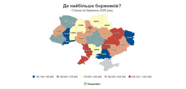 Найбільше боргів традиційно припадає на Дніпропетровщину, де налічується 1 052 990 проваджень, або близько 11% від усіх боргів у реєстрі. Далі йдуть Харківська область - 675 207 проваджень (7%), Київ - 667 215 (7%), Одеська область - 585 193 (6%) та Донецька область - 526 300 (6%).