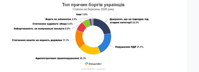 Найбільше боргів у реєстрі з’явилось через штрафи за порушення правил дорожнього руху - понад 2 млн проваджень (21%). Ще 20% становлять інші адміністративні правопорушення, не пов’язані з безпекою дорожнього руху - 1,93 млн випадків.