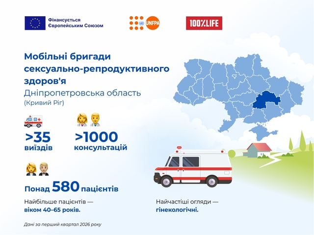 Проєкт реалізується в межах гуманітарного реагування UNFPA за підтримки Європейського Союзу у співпраці з БО «100% Життя». У першому кварталі 2026 року діють 10 регіональних бригад, зокрема мобільний пологовий будинок у Харківській області. Скористатись допомогою можуть усі жінки регіону — включно з ВПО, жінками з інвалідністю та постраждалими від насильства. Усі послуги — безоплатно та конфіденційно.