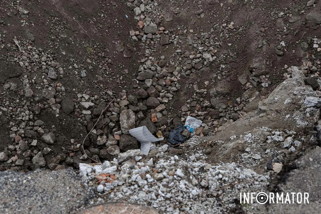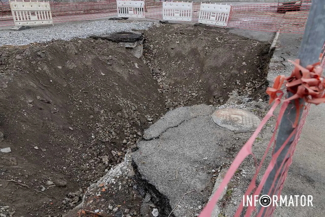 Яму огородили сіткою. Її частково засипали щебенем. Станом на 14:56 робітників тут не побачили.