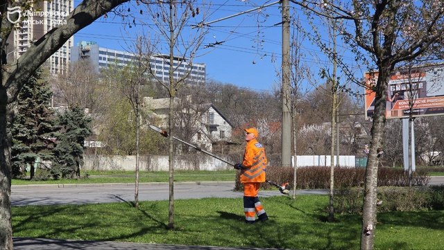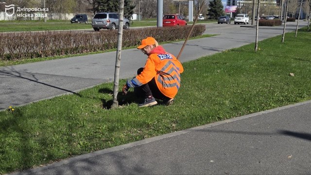 У зелених зонах Дніпра триває весняне прибирання. Зараз активні роботи проводять на Набережній Перемоги. Тут працюють дев’ять фахівців по всій протяжності локації.