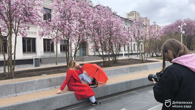 «Мы несколько раз проходили мимо этой площади и она привлекла нас своим современным и красивым видом. А вот эти розовые тучки цветов магнолии прекрасно дополняют архитектуру и придают ей красоту и гармонию. Кроме того, такие красивые цветы положительно влияют на психологическое состояние людей во время войны, ведь позволяют немного отвлечься от обыденности и окунуться в мир красоты».
