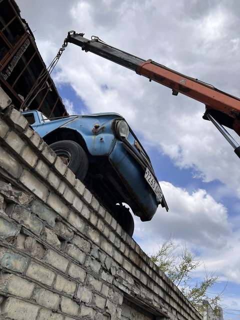 Це перший експонат, який довелося знімати краном із даху. Його стан складний: вибите скло, кузов пошкоджений і деформований вибуховою хвилею. Ймовірно, автомобіль стане донором для інших проєктів.