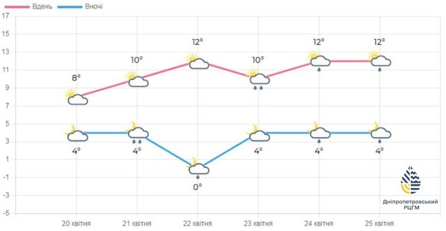 23-26 апреля под влиянием циклона с северо-востока ожидаются небольшие дожди и порывы ветра в дневные часы 15-20 м/с. Ночью 1..6°, днем 10..15°.