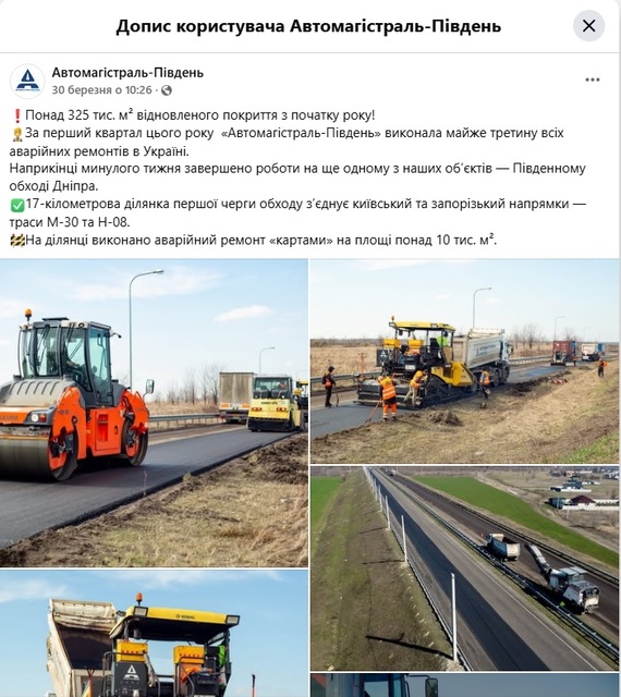 А 30 березня цього року ТОВ «Автомагістраль-Південь» повідомило, що в двадцятих числах березня «завершено роботи на ще одному з наших об’єктів – Південному обході Дніпра».