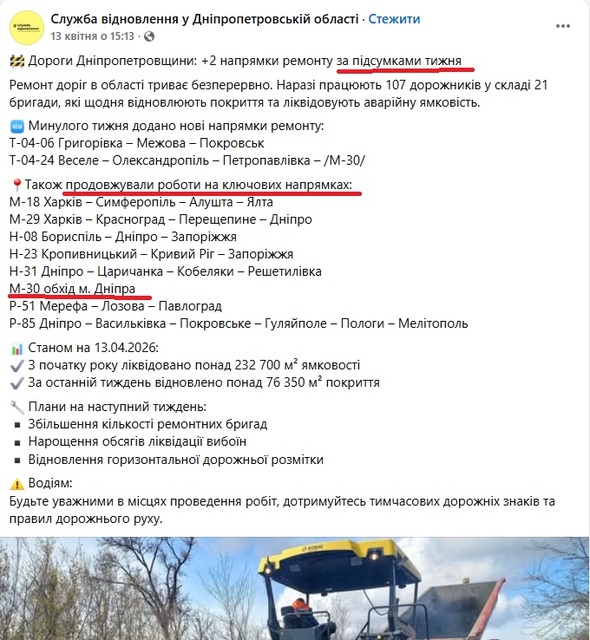 Хоча Служба відновлення та розвитку інфраструктури у Дніпропетровській області 13 квітня повідомила, що впродовж тижня з 6 по 12 квітня роботи з ремонту на дорозі М-30 обхід м. Дніпра тривали.