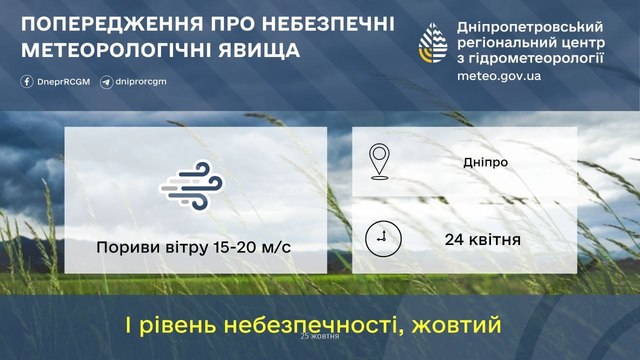 24 квітня у м. Дніпро очікуються пориви вітру 15-20 м/с.