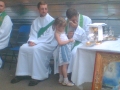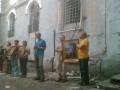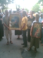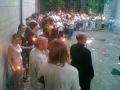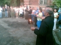 А пока юристы вели свои дискуссии в прохладном помещении, на разогретом проспекте возле храма состоялся очередной конфликт между верующими и компанией «Дагсбери». Римо-католики, которые проводили молебен сбоку здания, увидели как на них двигается КАМАЗ. Грузовик остановились лишь в нескольких сантиметрах от прихожан, и этого было достаточно, чтобы морально изможденные люди начали свирепеть. Они обступили КАМАЗ, ехавший забирать остатки крыши, и заявили, что не пропустят его, пока власть не выполнит свои обязанности по защите граждан. На место событий за несколько минут подъехало руководство «Дагсбери», охранной фирмы «Тайфун» и работники Кировского райотдела милиции. В то время, как оформлялись протоколы, к группе верующих и журналистов, которые осматривали храм и фотографировали разрушенную верхушку костела, подошел руководитель охранной фирмы «Тайфун», Николай Николаевич, и начал требовать от людей разойтись. Он не обратил внимание на то, что люди находятся в обычном дворе, который совершенно точно не является собственностью «Дагсбери».