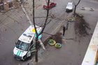 Легковое авто и микроавтобус столкнулись на перекрестке. После удара инкассаторская машина врезалась в столб с дорожными знаками, который упал прямо на нее.