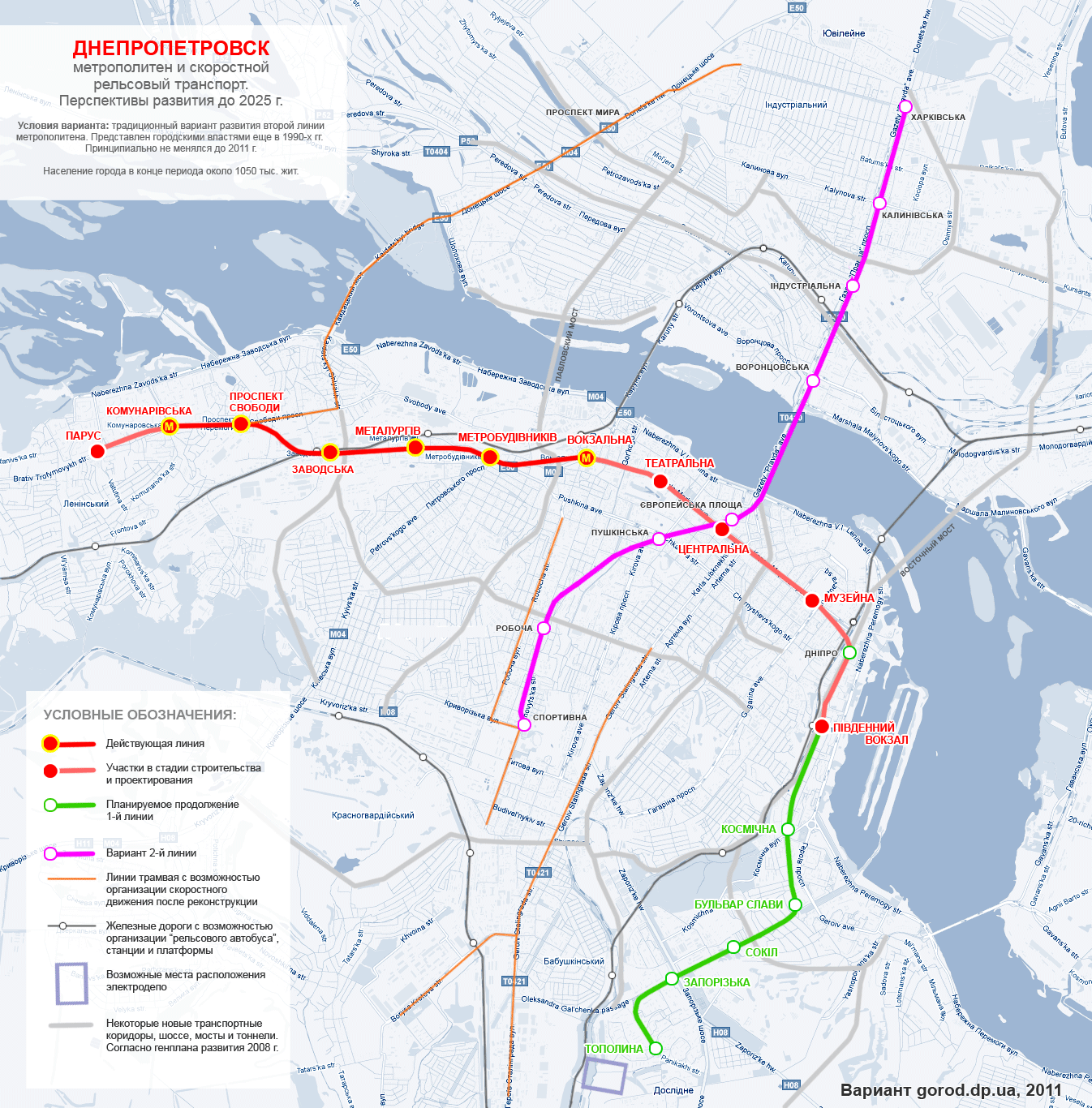 Планируется вторая линия с правого на левый берег р. Днепр протяженностью 13,5 км с 7-ю станциями. Из них 3 станции на левом берегу. А также продолжение первой линии до ж.м. Тополь-3, всего 6 новых станций после ст. Музейна (Лоцманська, Космічна, бульвар Слави, Сокіл, Запорізька, Тополина).