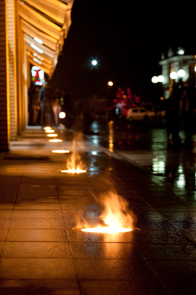 Во время дождя с ламп испарялась вода - при длительной выдержке пар напоминает языки пламени ;)