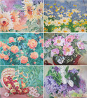 Новые работы автор нарисовала специально для арт-площадки. Большую часть выставки составляют яркие, солнечные полотна с изображением цветов - сирени, ромашек, пионов, подсолнухов, а также фруктовые натюрморты.