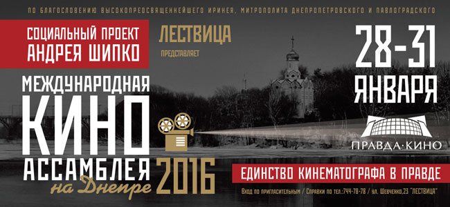 При этом фильмы, тщательно подбираемые отцом Игорем для показа, не просто интеллектуальные, но и интересные для просмотра зрителями всех возрастов и профессий. Очень разные по жанрам, духовному наполнению киноленты отец Игорь подобрал и для «Киноассамблеи на Днепре»-2016. Как и ранее, праздник правдивого и умного кино пройдет при поддержке неизменного мецената всех проектов «Лествицы» Андрея Шипко и по благословению митрополита Днепропетровского и Павлоградского, высокопреосвященнейшего Иринея.