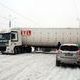Выезжая на проезжую часть улицы Сыровца из ЦУМа, грузовик застрял на скользкой дороге. Автомобилям приходится объезжать препятствие по трамвайным рельсам и по встречной полосе. По словам водителя трейлера, дорога слишком скользкая, а потому он не может ни заехать обратно, ни выехать на Сыровца.