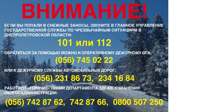 Якщо ви потрапили в снігові замети, телефонуйте до головного управління Державної служби з надзвичайних ситуацій у Дніпропетровській області: 101 або 112.
