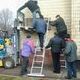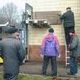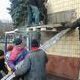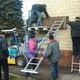 Рабочие пытаются снять с фасада мемориальную табличку, говорящую о том, что борьбу с фашистами в Днепродзержинске возглавлял коммунист Казимир Ляудис.