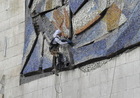 В Каменском продолжаются работы по демонтажу барельефа пловчихи со здания бассейна «МиКомп», что на проспекте Аношкина.