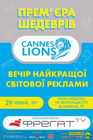 В Днепре состоится Премьера Шедевров рекламных роликов Каннских Львов. Показ пройдет в Театре Горького, 29 июня 2016 года. Начало в 19.00