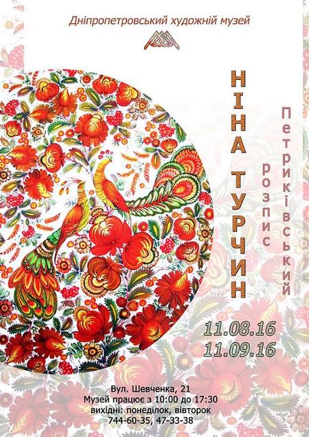 Теплі кольори, пташки, що неодмінно співають, букети квітів. Видатний майстер петриківського розпису Ніна Турчин презентує свою першу персональну виставку. Роботи, виконані з душею, можна буде переглянути в Дніпропетровському художньому музеї.