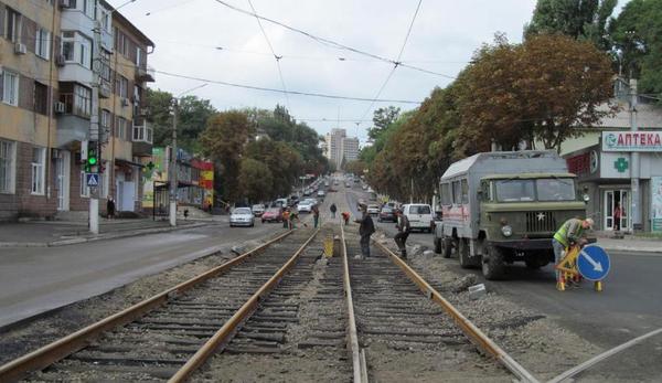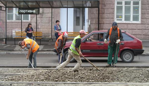 Продолжается ремонт трамвайных путей по пр. Шевченко (бывш. Сыровца). Утром 31 августа уже укладывали рельсы на перекрестке с ул. Спортивной.