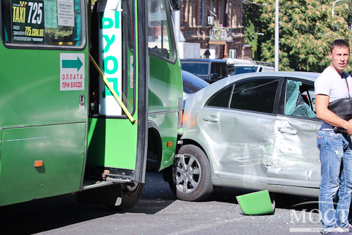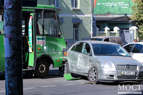 Пассажирский автобус, двигаясь по ул. Фабра в направлении пр. Яворницкого, столкнулся с иномаркой, двигавшейся по ул. Старокозацкой в сторону ул. Воскресенской (Ленина).