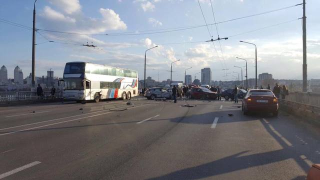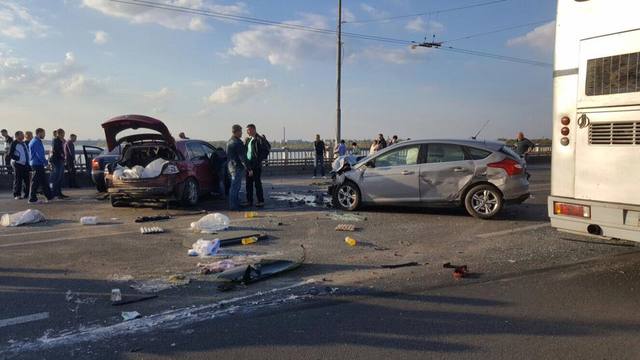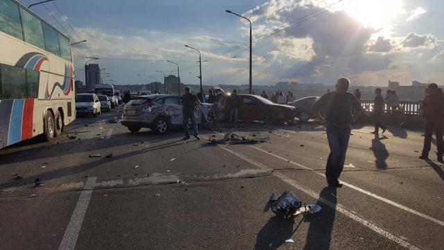 По неизвестной пока причине, один из автомобилей, едущий на левый берег, внезапно оказался на полосе встречного движения. По направлению к нему, в крайней левой полосе, в сторону центра, на высокой скорости двигался красный Рено. Произошло лобовое столкновение по касательной, Рено потерял управление, ушел в занос и вращение. Это спровоцировало дальнейшие столкновения.