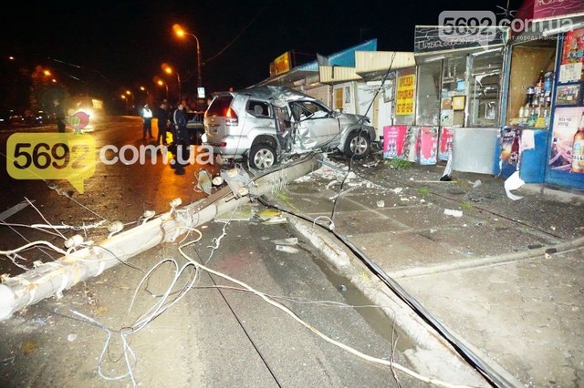 Как удалось выяснить журналистам 5692.com.ua на месте ДТП, джип "Тойота Прадо" двигался со стороны ночного клуба "Украина" по проспекту Василия Стуса (проспект Комсомольский) по трамвайным путям. Недалеко от самой остановки "Заря" водитель потерял управление и машина "юзом" влетела в киоск, зацепив правым боком столб. На момент ДТП в машине было 6 человек. На место происшествия было вызвано 4 автомобиля скорой помощи, 1 машина ГСЧС, 5 патрулей полиции и ремонтная бригада КП "Трамвай".