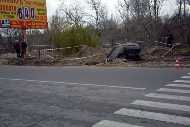 Если вчера в ремонтируемом сливном колодце на проспекте Свободы погиб мужчина, сегодня в разрытую траншею на проспекте Металлургов угодил автомобиль.