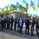 Участники митинга выстроились в несколько рядов напротив памятника Тарасу Шевченко и держали в руках удочки с сине-желтыми флагами.