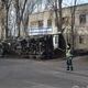 Содержимое перевернувшейся емкости вылилось на дорогу и тротуар, основательно забрызгав расположенное у дороги двухэтажное здание.