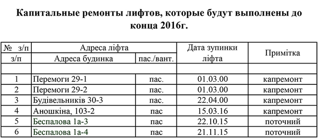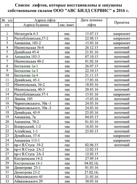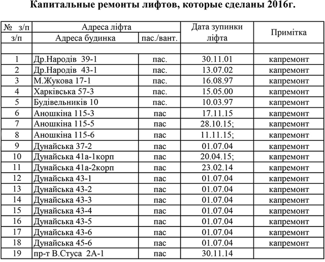 Владимир  (11.12.16 09:46): В списке, где указаны восстановленные лифты, указан адрес под номером 21 Белорусский 1 (белорусский проезд), так вот, это враньё, лифт никто не делал, он не рабочий!!! стоит новый около 16 лет ... ни разу не работал!!! Відповісти | З цитатою