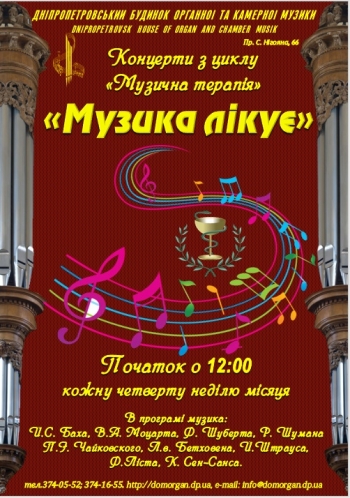 Жителей Днепропетровщины будут лечить композициями Баха, Моцарта, Шуберта, Шумана, Чайковского, Бетховена, Штрауса. Прекрасные мелодии сыграют на органе, бандуре, скрипке, кларнете и фортепиано.