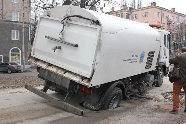 На проспекте Пушкина возле памятника Пушкину автомобиль КП «Уреа» провалился задними колесами под асфальт.
