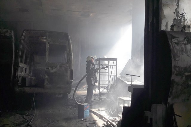 Огнем уничтожено 4 окна, инструменты, автомобиль Mercedes Sprinter и повреждена мебель, станки, вентиляционная шахта, въездные ворота, металлическую облицовку стен и крыши внутри ремонтного бокса на общей площади 150 кв.м.