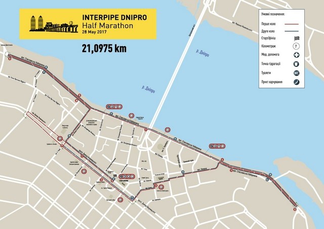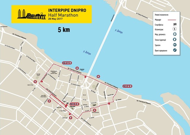 (5 км) пл. Героев Майдана (старт) - просп. Дмитрия Яворницкого - ул. Харьковская - ул. Магдебургского права - пл. Успенская - ул. Литейная - ул. Сечеславская Набережная - ул. Юлиуша Словацкого - просп. Дмитрия Яворницкого - пл. Героев Майдана (финиш).