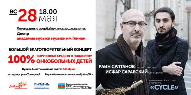 Уже в это воскресенье, 28 мая, в 18.00 в днепровской академии музыки им.Глинки известные азербайджанские джазмены Раин Султанов (сопрано, саксофон) и Исфар Сарабский (орган, рояль) специально прилетят из Баку на один день в Днепр, чтобы дать большой благотворительный концерт в рамках своего европейского турне с программой «CYCLE».