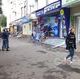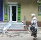 Прохожие с любопытством разглядывают разбитый стеклопакет, лежащий на крыльце банка.