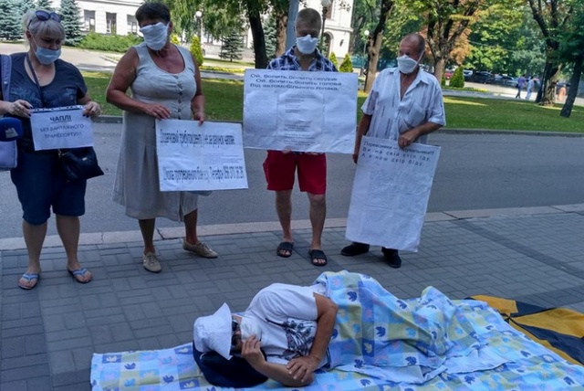 Митингующие легли на клеенке возле здания ОГА, рассказывая, что не могут выспаться у себя дома за постоянного грохота грузовиков и будут теперь спать здесь.