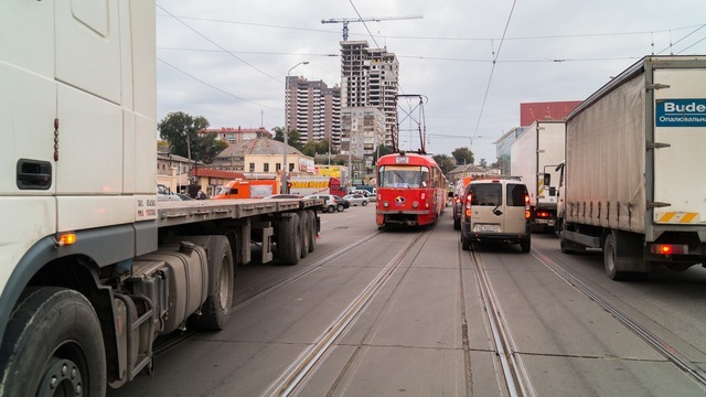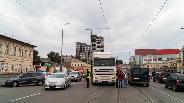 На месте работает полиция. Движение затруднено. Также на время приостановлено движение 12-го трамвая, поскольку, на данный момент, фура находится на трамвайных путях.