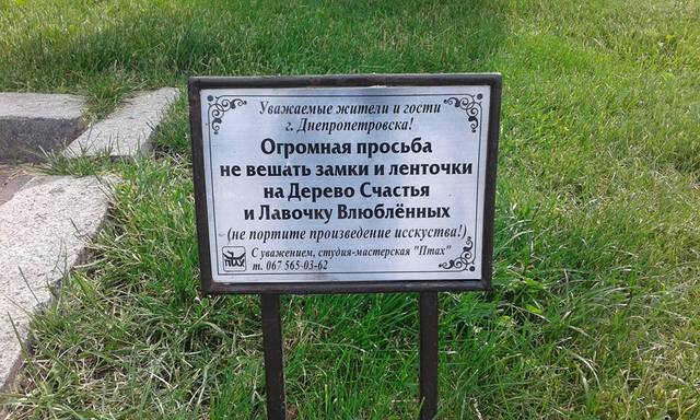 «Жители Днепра! Давайте попробуем искоренить наш «быдломенталитет»! На фото - изделия, которые выполнили и установили совершенно безвозмездно для нашего города мои друзья-кузнецы и просто замечательные люди - фирма «Птах». Совсем недавно эти изделия были ими же отреставрированы после обвешивания совершенно дурацкими замочками. Их наши «брачующиеся» цепляют в надежде на долгую и счастливую совместную жизнь. Еще добавляют непонятные ленточки и обрисовывают дерево корректорами (видимо, некоторые субъекты возомнили себя первобытными людьми и считают, что они оставляют «наскальные рисунки» для истории). Заодно «памятными надписями» разрисовывают и влюбленных Колобков по соседству…