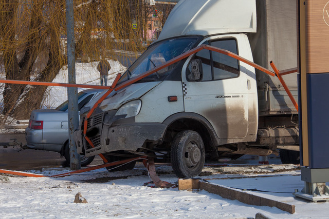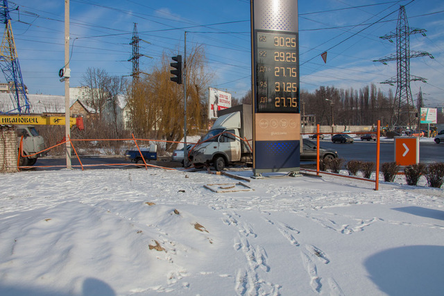 Газель протаранила ограждение. По словам сотрудников заправки, если бы Газель проехала еще пару метров, то снесла бы рекламный стенд за 15 тысяч долларов.