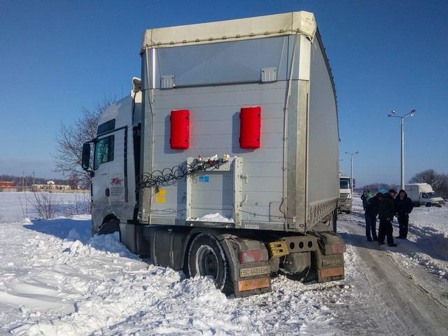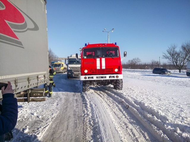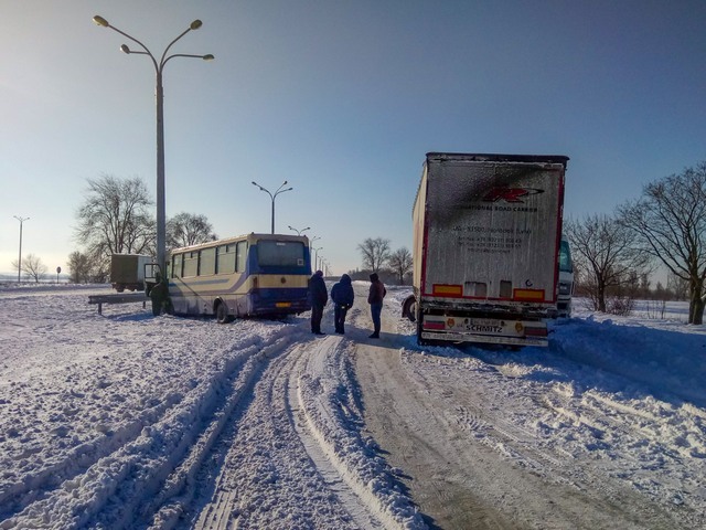 Фура ехала по трассе со стороны Днепра, перед поворотом на Каменское из-за заснеженной дороги автомобиль занесло вправо и «сложило». За ним ехало маршрутное такси №100 с пассажирами, которое съехало с трассы влево и врезалось в фонарный столб. В результате инцидента никто не пострадал.