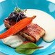 Окунь с яблочно-тыквенным пюре и пирожком с пате из копченой крови.