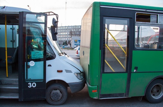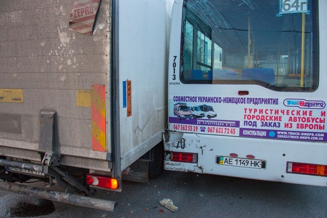 4 апреля около 18:10 на Слобожанском проспекте произошло ДТП. Грузовик Renault по касательной врезался в маршрутку Mercedes, которая въехала в другую.